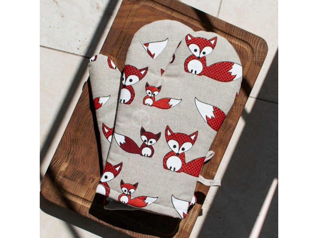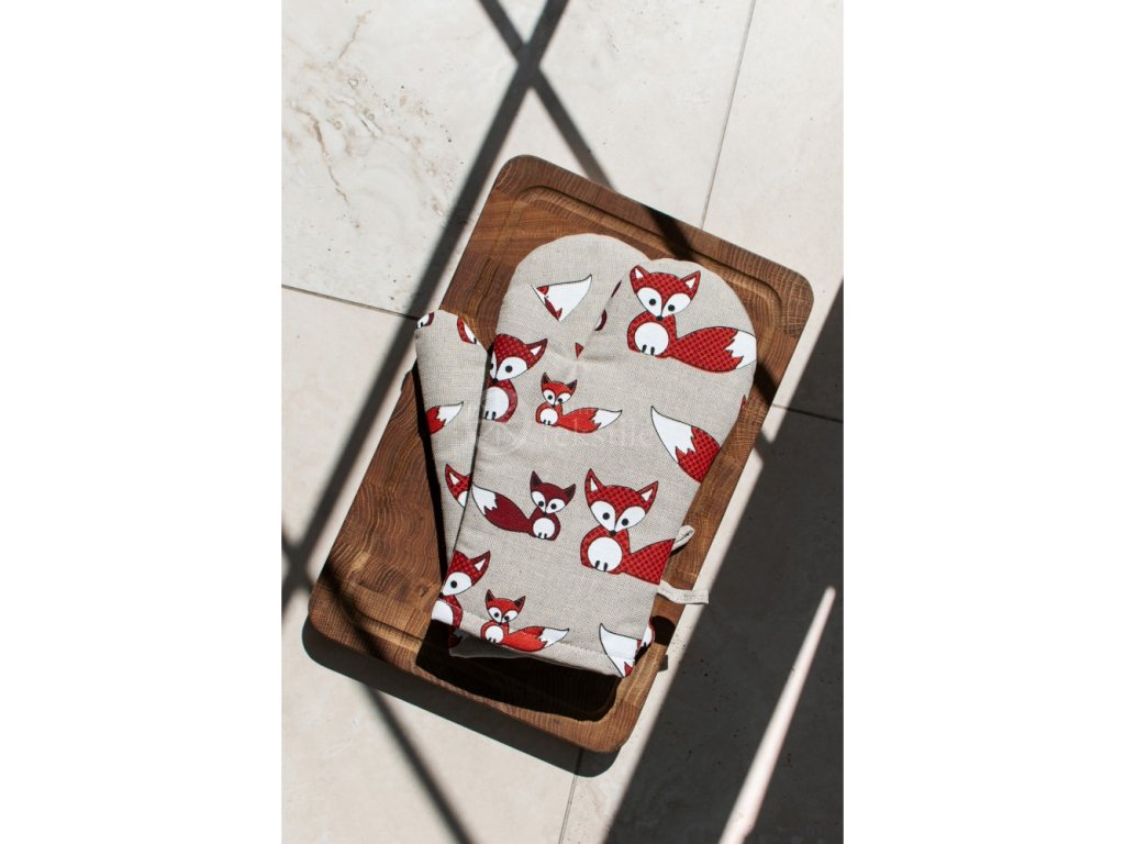 Praktická a nadmíru užitečná je kuchyňská chňapka, která je vyrobená z kombinace lnu a bavlny. Rozměr chňapky je 30 x 15 cm. Lněná chňapka je potištěna veselým pestrobarevným motivem rozverných lišek v červenobílé barvě. Chňapka má očko pro její snadné zavěšení.