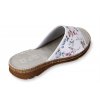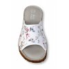 Dámské kožené pantofle v bílé barvě s potiskem barevných květů jsou určeny pro použití v exteriéru. Kožené pantofle jsou nazouvací, v přední části je špička otevřená. Pro výrobu pantoflí byla použita hovězí kůže, která drží tvar a díky tomu se obuv nošením nezdeformuje.