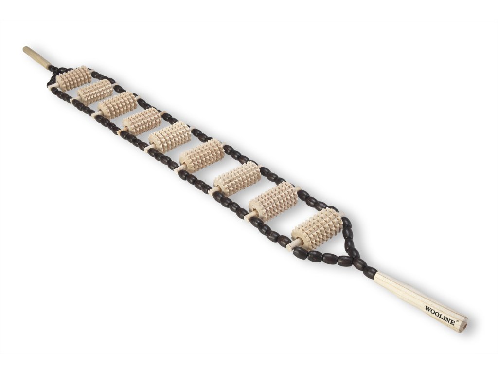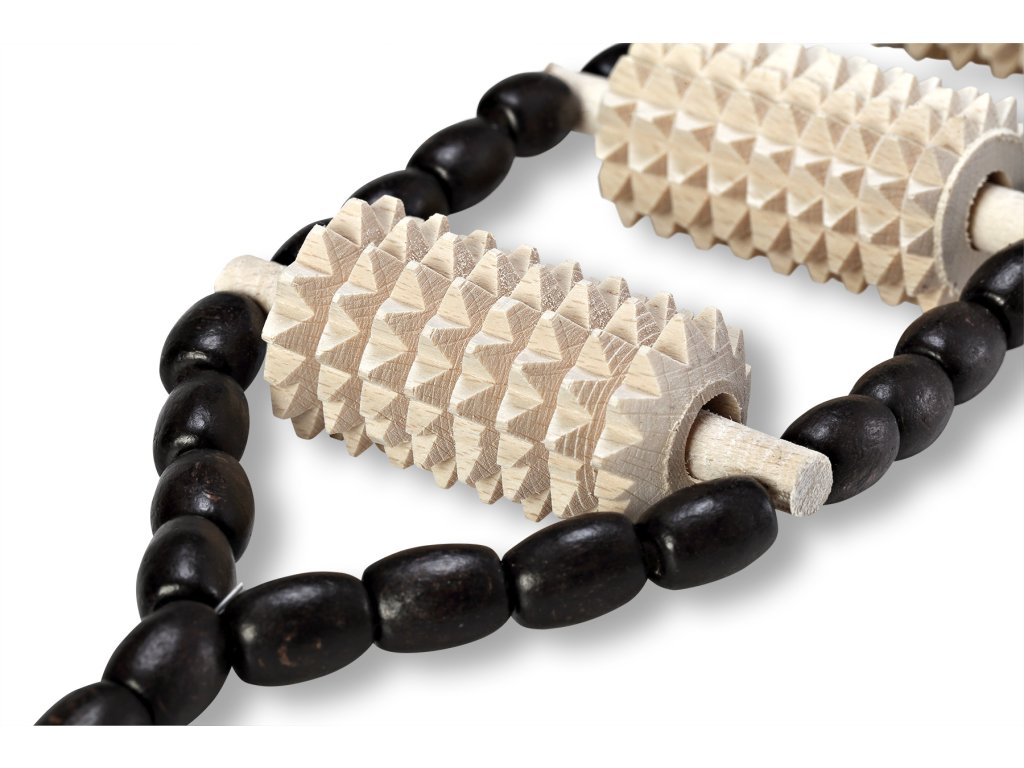 Masážní pás na záda je vyroben ze smrkového dřeva v kombinaci s dřevěnými korálky. Je navržen speciálně pro masáž zad a je možné jej použít také na masáž nohou a rukou. Masáž je primárně realizována velkými válci o průměru 3 cm. Malé doprovodné korálky jsou velice příjemné na dotyk s pokožkou a na pokožku působí uklidňujícím dojmem. Dřevěný masážní pás je opatřen z obou stran úchyty o délce 9,5 cm.