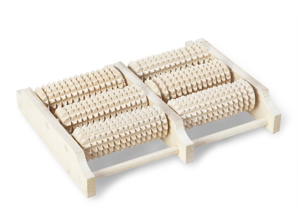 Tato dřevěná masážní pomůcka je určena primárně pro masáž unavených chodidel. Jedná se o příruční masážní strojek ze smrkového dřeva, který je opatřen 6 masážními válečky. Jeden váleček je široký 9 cm a jeho průměr je 3 cm. Masážní strojek Vám se svými 6 rotujícími válečky s malými výčnělky dopřeje odpočinkovou masáž chodidel. Masírování chodidel ulevuje od bolesti, podporuje cirkulaci krve a napomáhá k vyplavování škodlivých toxinů z těla.