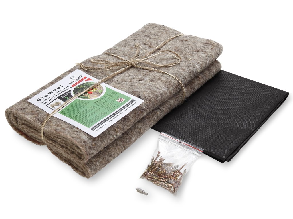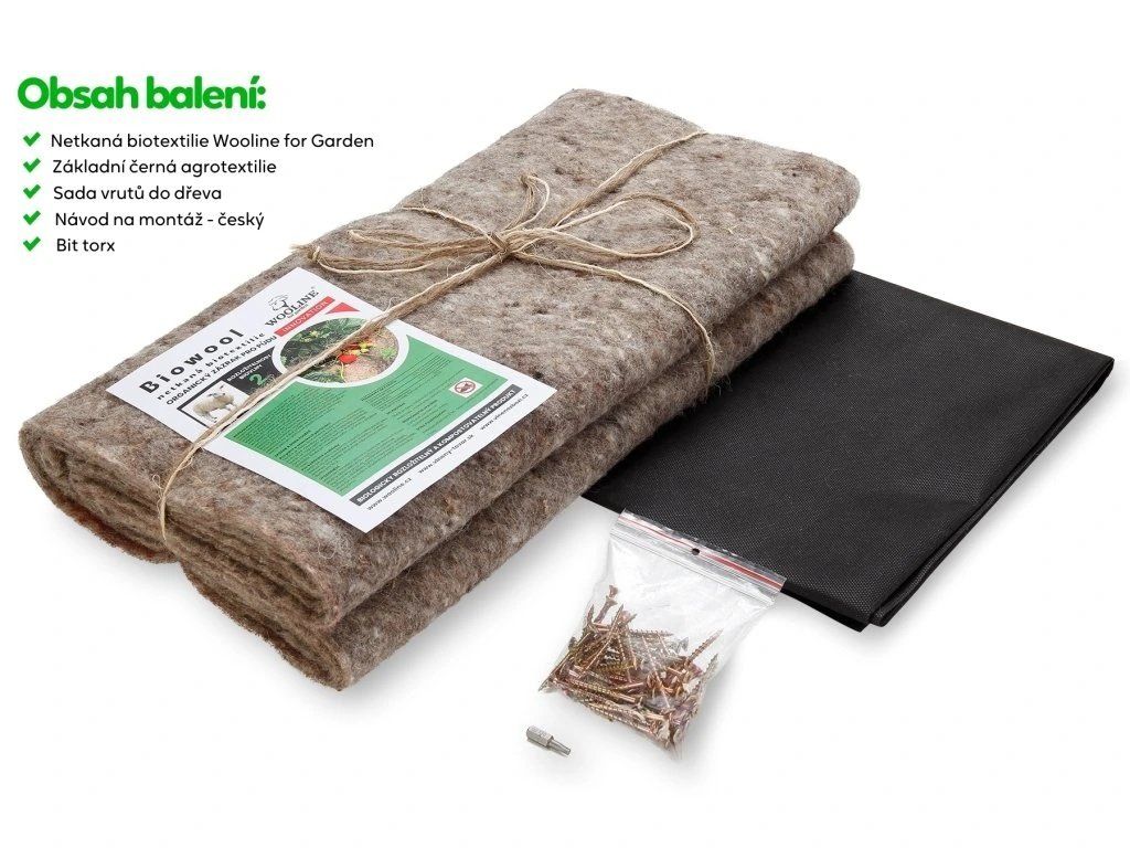 - Součástí balení jsou dva druhy netkaných textilií - 1 ks černé agrotextilie o rozměru základny vyvýšeného záhonu, která se umísťuje jako podkladová 1. vrstva vrstvení. Dále je součástí balení 1 ks netkané biotextilie Wooline for Garden©. Jedná se o hnojící textilii z ovčí vlny, která je biologicky rozložitelná a je napuštěna ekologickým hnojivem. Má funkci postupného uvolňování dusíku a draslíku do půdy. Použití textilie umožňuje rostlinám efektivně využívat živiny v půdě snížením odpařování vody. Použití textilie vytváří přirozenou bariéru proti slimákům, omezuje růst plevele, snižuje nepříznivé účinky větru na půdu, zabraňuje zhutňování půdy při silných deštích, předchází znečištění plodů zeminou (jahod, lesních jahod) a přispívá ke zvýšení aktivity prospěšné půdní mikroflóry dodáním organické hmoty. Textilii lze použít při pěstování na volné půdě i ve skleníkovém pěstování, stejně jako pro pokojové a balkonové rostliny.