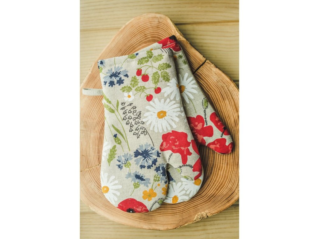 Praktická a nadmíru užitečná, to je kuchyňská chňapka vyrobená z kombinace lnu a bavlny. Rozměr chňapky je 30 x 15 cm. Lněná chňapka je potištěna pestrobarevným motivem kvetoucích máků a jiných květů. Chňapka má očko pro její zavěšení.