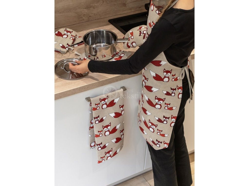 Kuchyňskou utěrku s motivem veselých lišek lze sladit s dalšími kuchyňskými doplňky z naší nabídky jako jsou chňapky, kuchyňské zástěry nebo lněné tašky na nákup.