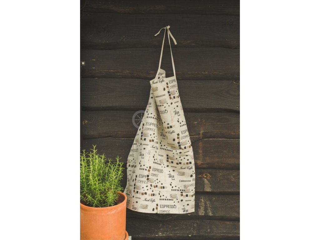 Praktická a nezbytná kuchyňská zástěra vyrobená z kombinace lnu a bavlny. Délka zástěry je 70 cm. Lněná zástěra je potištěna univerzálním motivem kávy, kávových zrnek a textů Espresso. Zástěra má praktické zavazování v oblasti pasu a za krkem.