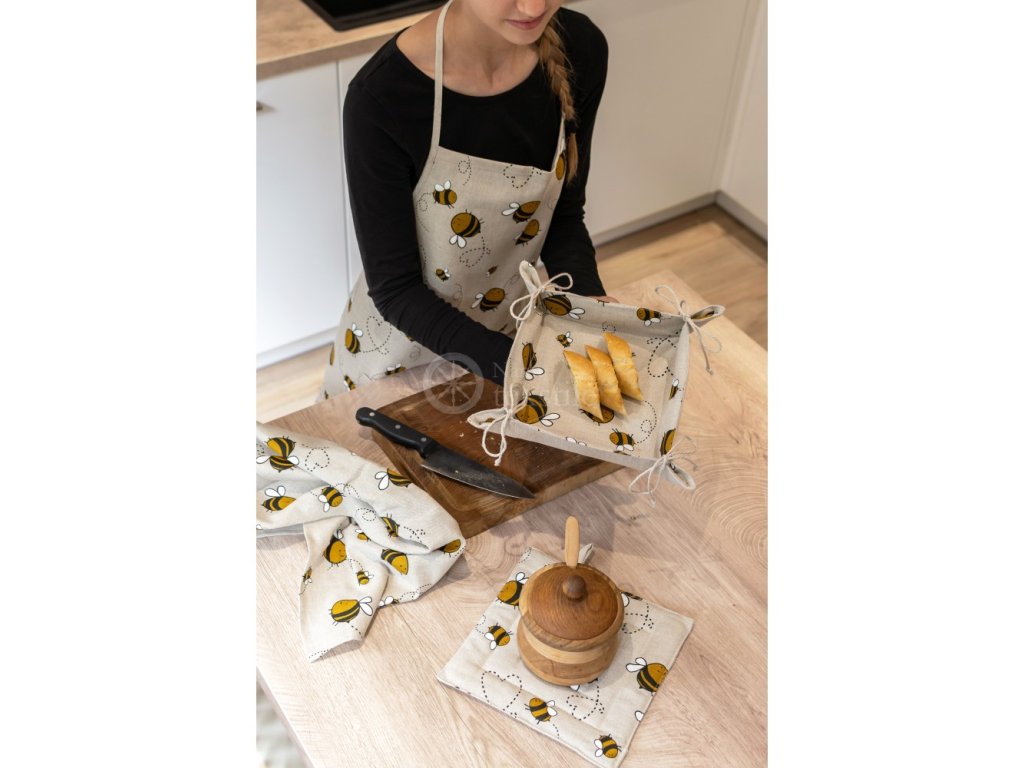 Kuchyňskou zástěru s motivem veselých včel lze sladit s dalšími kuchyňskými doplňky z naší nabídky jako jsou chňapky, kuchyňské utěrky nebo lněné tašky na nákup.