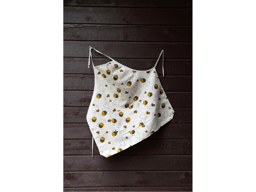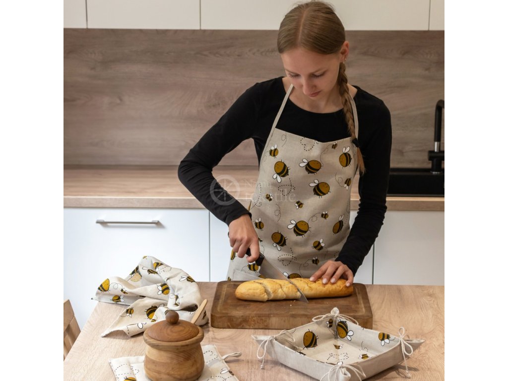 Praktická a nezbytná kuchyňská zástěra vyrobená z kombinace lnu a bavlny. Délka zástěry je 70 cm. Lněná zástěra je potištěna veselým motivem včelek ve žluté barvě. Zástěra má praktické zavazování v oblasti pasu a za krkem.