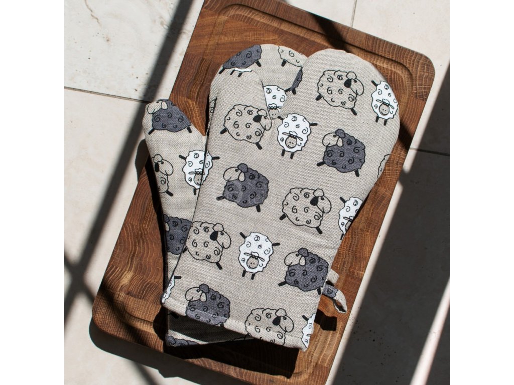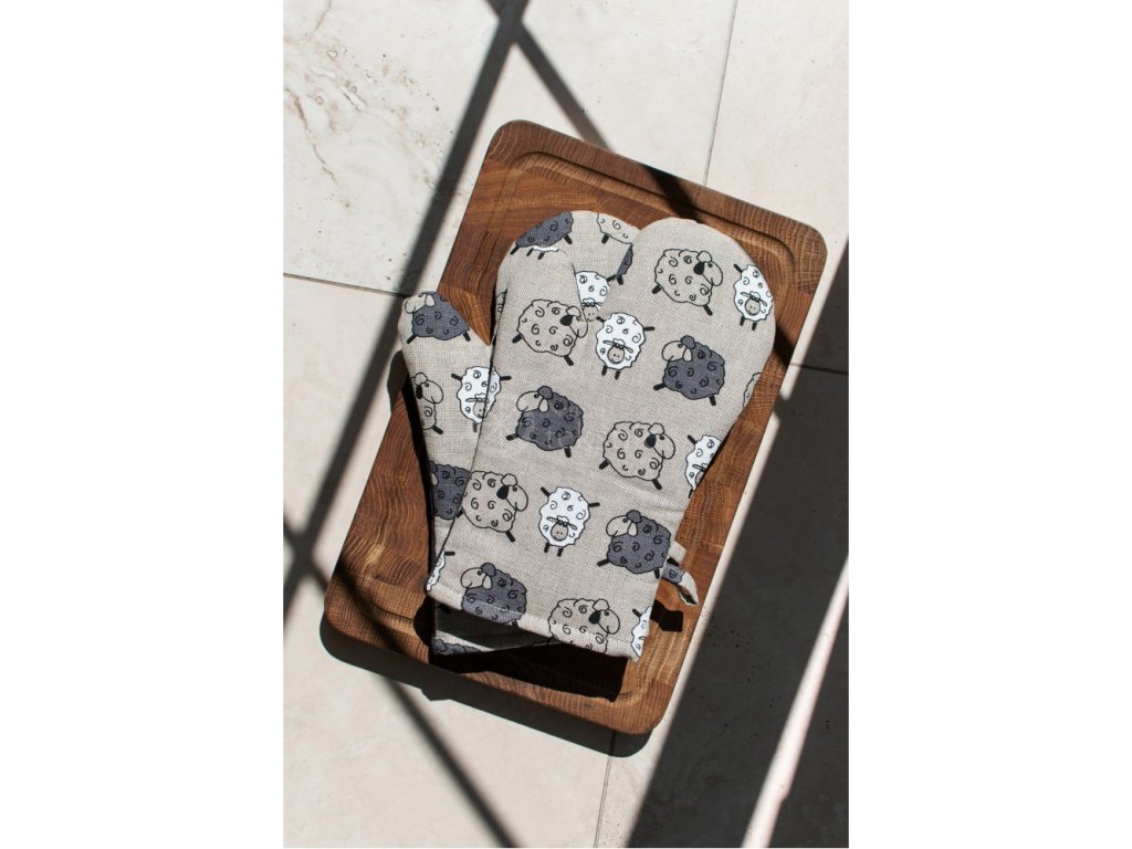 Praktická a nadmíru užitečná je kuchyňská chňapka, která je vyrobená z kombinace lnu a bavlny. Rozměr chňapky je 30 x 15 cm. Lněná chňapka je potištěna motivem oveček v šedobílé barvě. Chňapka má očko pro její snadné zavěšení.