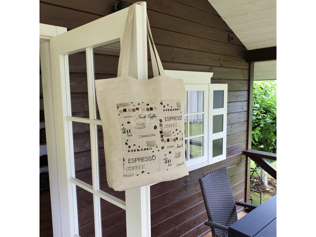 Pokud jste milovníkem kávy, tak Vám nesmí chybět tato praktická lněná nákupní taška s motivem kávy, kávových zrnek a textů Espresso. Taška je vhodná na nákupy, na výlety nebo třeba na pláž. Rozměr cestovní tašky je 40 x 38 x 8 cm. Díky kombinaci lnu a bavlny je taška dostatečně pevná. Praktická ucha o délce 64 cm zajistí velice dobrou manipulovatelnost s taškou.