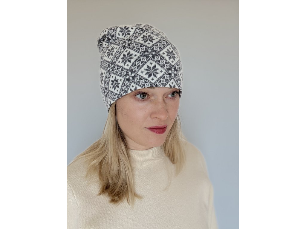 Hřejivá zimní čepice Miia vyrobená z Merino vlny v šedobílé barvě je opatřena norskými motivy. Merino čepice je strojově pletená. Tato zimní čepice může být nasazena klasicky, bez využití dvojitého lemu. Je také možné si čepici obrátit vnitřní stranou nahoru a vytvořit v oblasti čela, uší a zátylku dvojitý lem. Nošení této čepice je velice komfortní, jelikož dvojitý lem zajistí příjemné teplo v těchto problematických partiích zejména v zimním období. Úplet je vyroben z hebké merino vlny, která je velice jemná a hřejivá na dotyk.