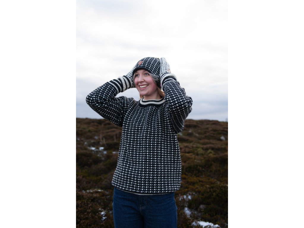 Nadčasový hřejivý vlněný svetr je vyroben ze 100% norské vlny. Tento norský svetr má univerzální střih lichotící každé postavě. Je určen pro muže i ženy. Svetr doporučujeme používat v chladnějších obdobích roku. Vlněný svetr Sebastian je velice pohodlný a komfortní. Svetr Sebastian v černé barvě s bílými motivy s kulatým výstřihem se stane i Vaším oblíbeným tlustým svetrem pro chladnější období roku.