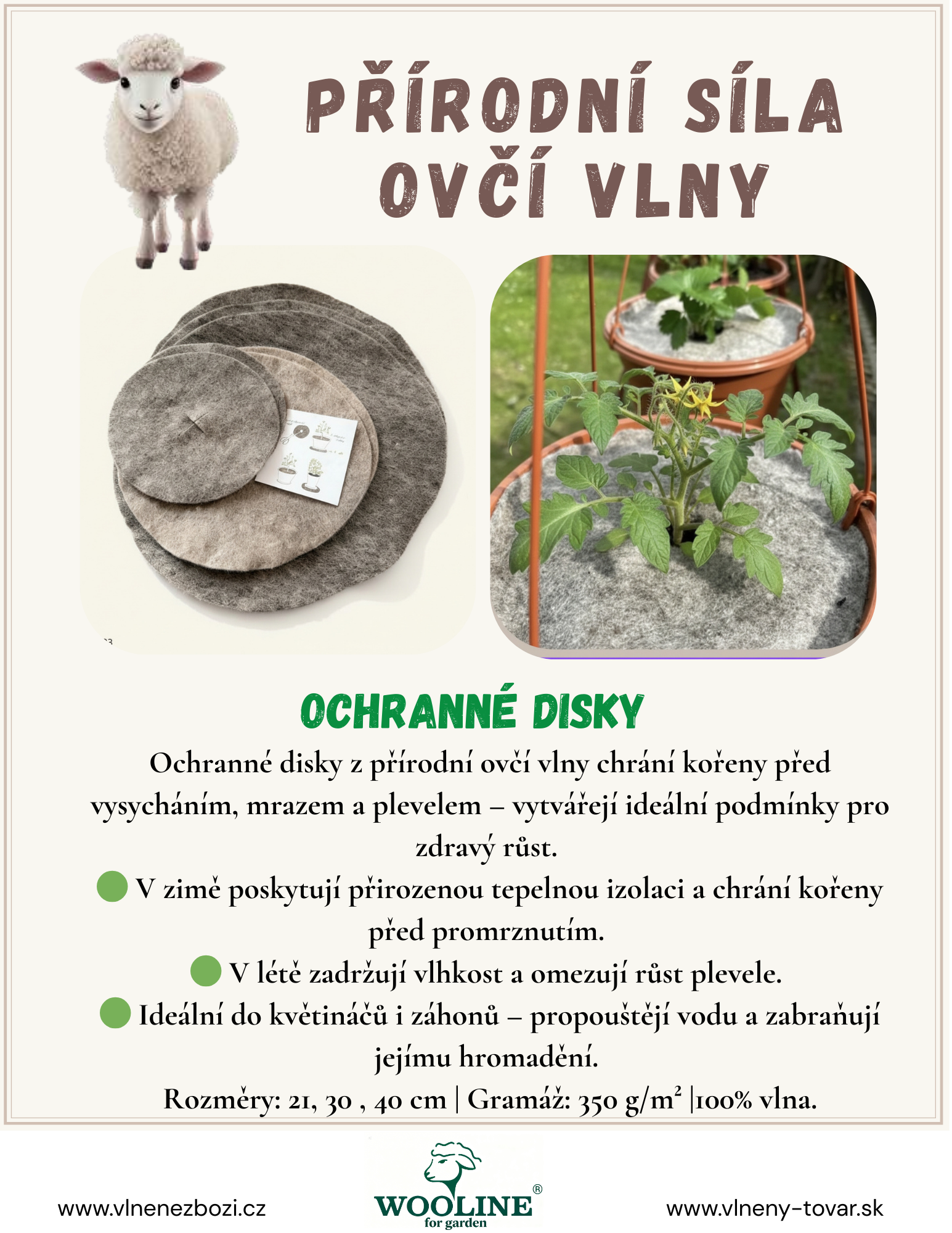 - Ekologie: Ochranné disky z ovčí vlny jsou 100% biologicky odbouratelné a po několika letech se přirozeně rozloží na humus.