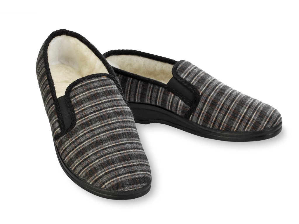 Tyto domácí kotníkové pantofle pro seniory jsou v základu v šedé barvě zdobené motivem káro. Jedná se o domácí obuv, která je určena k používání v interiéru. Pantofle jsou velmi lehké na nošení, noha jimi není zatížena.