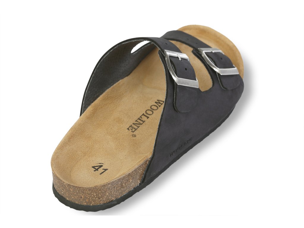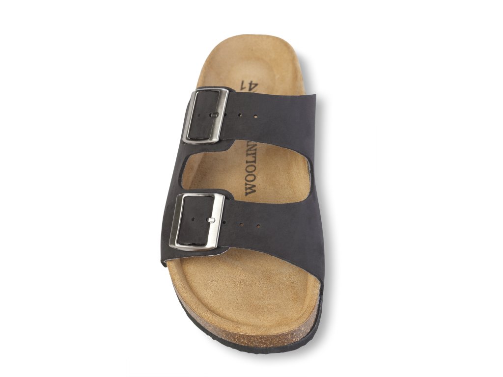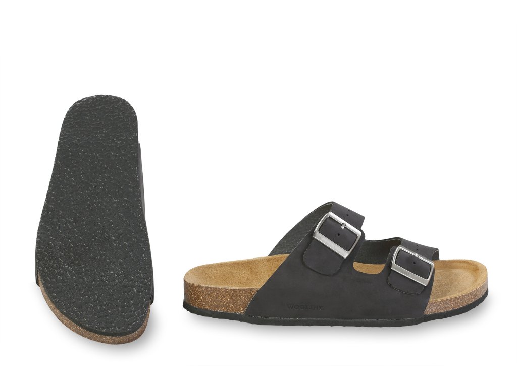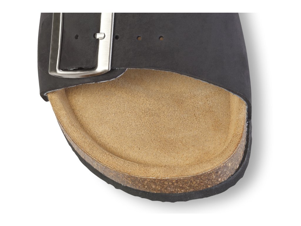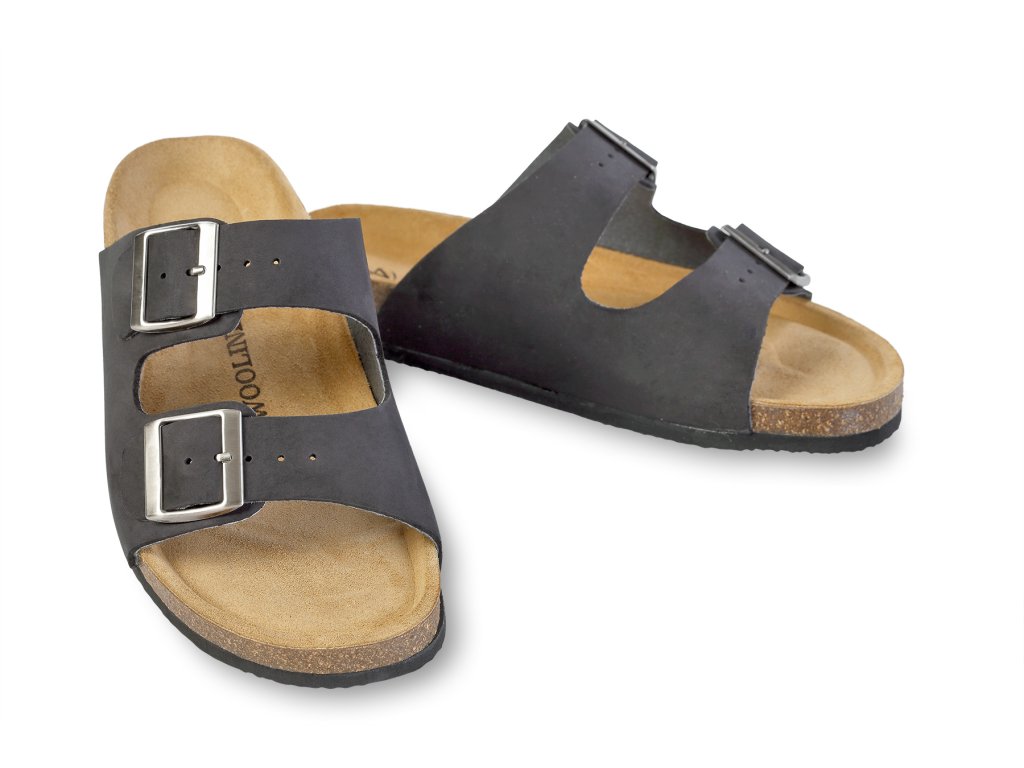 Stylové korkové zdravotní pantofle pro muže v černé barvě mají svrchní část vyrobenou z elegantní hladké hovězí kůže. Pantofle jsou v horní části prošívané a v horní části jsou opatřeny dvěma polohovatelnými přezkami. Díky tomuto praktickému řešení je možné si obuv přizpůsobit přesné velikosti své nohy v oblasti nártu. Obě přezky jsou kovové. Pantofle jsou v prostoru špičky a po stranách otevřené. Díky tomu dochází při pohybu k velmi dobré cirkulaci vzduchu. Podrážka pánských korkových pantoflí je vyrobena z protiskluzového syntetického materiálu.
