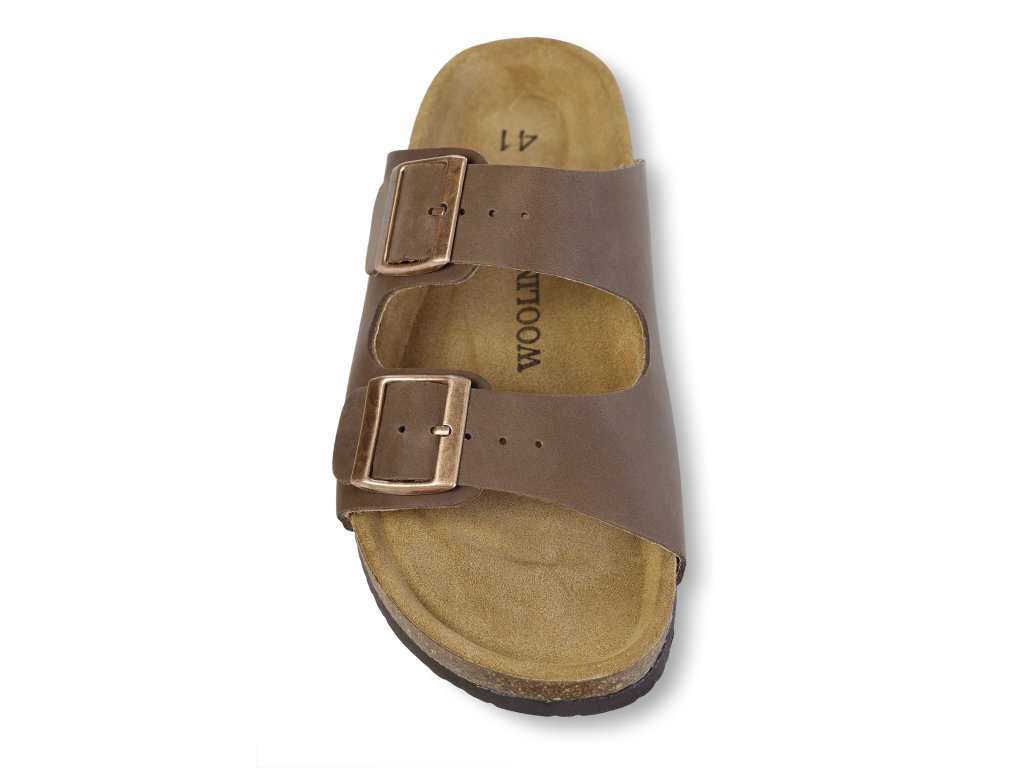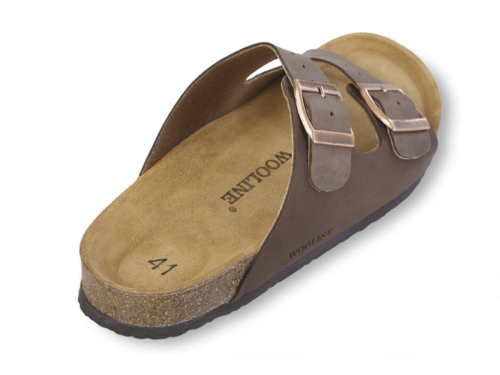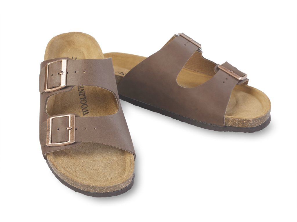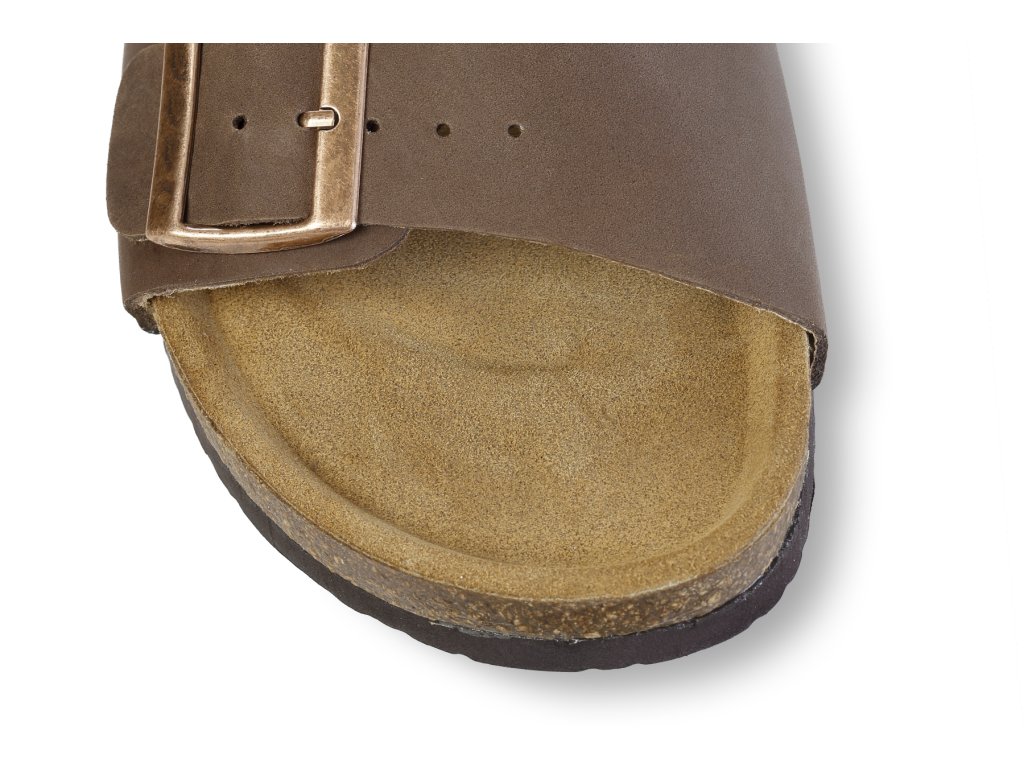 Stylové zdravotní korkové pantofle pro muže v hnědé barvě mají svrchní část vyrobenou z elegantní hladké hovězí kůže. Pantofle jsou v horní části prošívané a v horní části jsou opatřeny dvěma polohovatelnými přezkami. Díky tomuto praktickému řešení je možné si obuv přizpůsobit přesné velikosti své nohy v oblasti nártu. Obě přezky jsou kovové. Pantofle jsou v prostoru špičky a po stranách otevřené. Díky tomu dochází při pohybu k velmi dobré cirkulaci vzduchu. Podrážka pánských korkových pantoflí je vyrobena z protiskluzového syntetického materiálu.