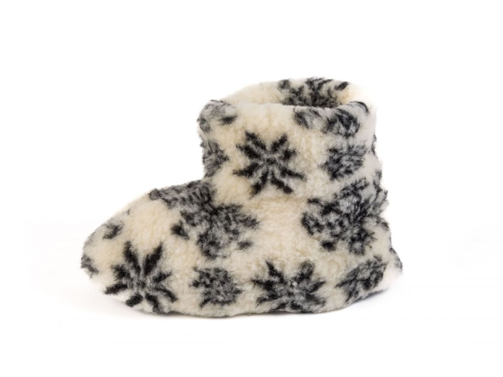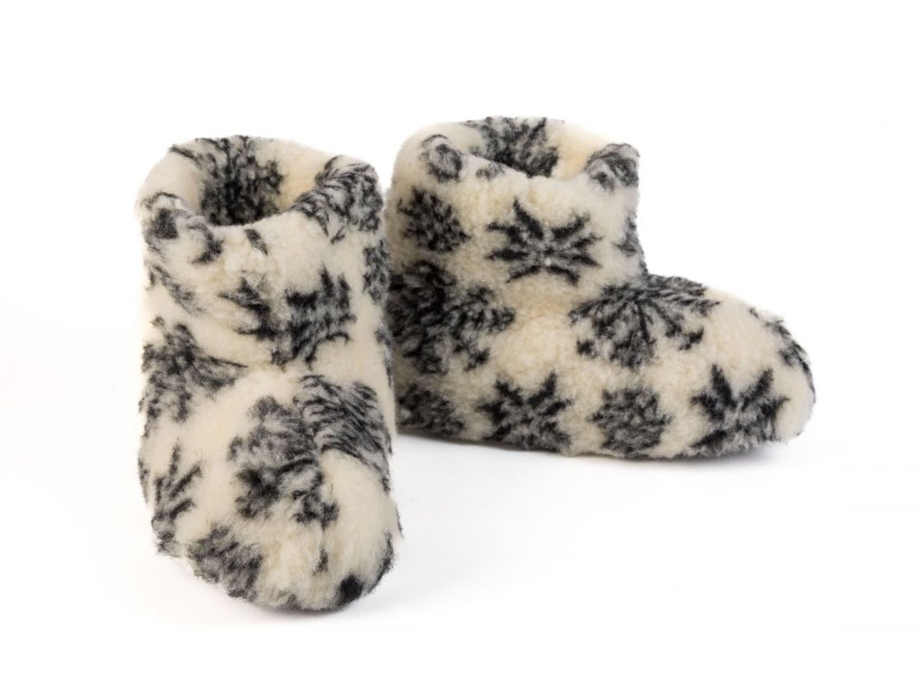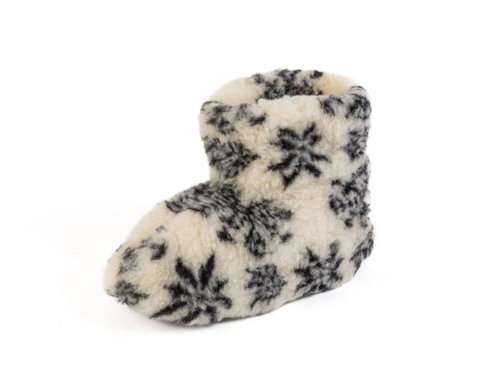 Tyto pohodlné vlněné bačkory na domácí použití jsou velice oblíbené pro jejich vysoký tepelný komfort. Podrážka je vyrobena z plastu a je protiskluzová. Tato obuv není určena pro použití v exteriéru.