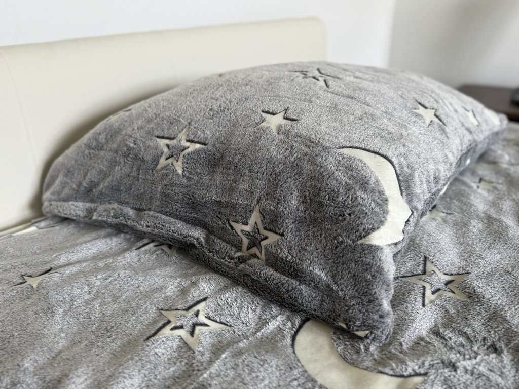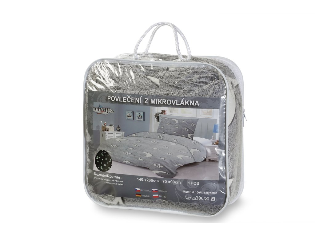 Hebké ložní povlečení v šedé barvě s motivem svítících hvězd. Toto hebké a hřejivé povlečení obsahuje 1 ks povlečení na přikrývku o rozměru 140 x 200 cm a 1 ks povlaku na polštář o rozměru 70 x 90 cm daného motivu. Povlečení je vyrobené ze 100% Polyesteru označovaného jako Mikroplyš. Pro zajištění dlouhodobé životnosti doporučujeme prát ložní povlečení při teplotě 40 °C.