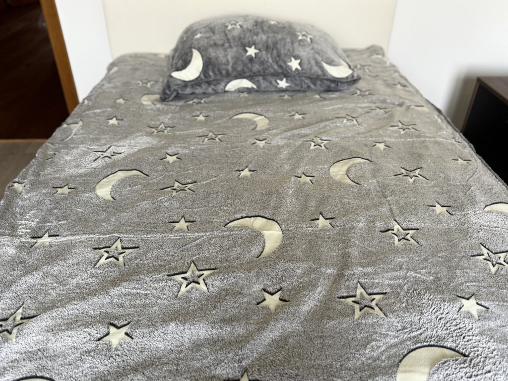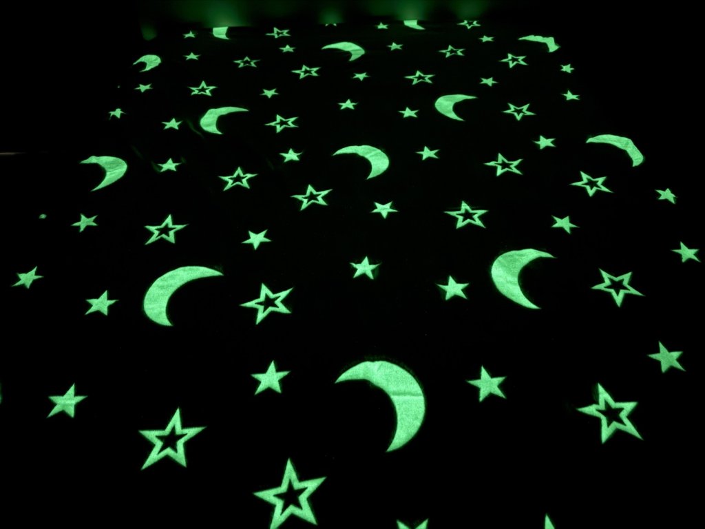 Ložní povlečení je vyrobeno v kombinaci šedé a žluté barvy. Povlečení je v základu v šedé barvě. Na šedém podkladu je vyobrazena noční obloha v podobě hnězdiček a měsíce. Mikroplyšové povlečení je kouzelné v tom, že při zhasnutí světla se tato noční obloha rozsvítí a Vy tak můžete usínat pod svítící noční oblohou.