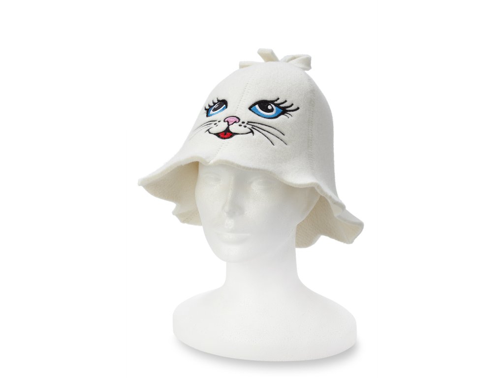 Veselá saunová čepice ze 100% vlny (filcová vlna) je dodávaná s veselým motivem modrooké kočky. Vlněná čepice je určena pro děti pro použití v sauně. Díky použitému materiálu je čepice pevnější, odolnější a trvanlivější.