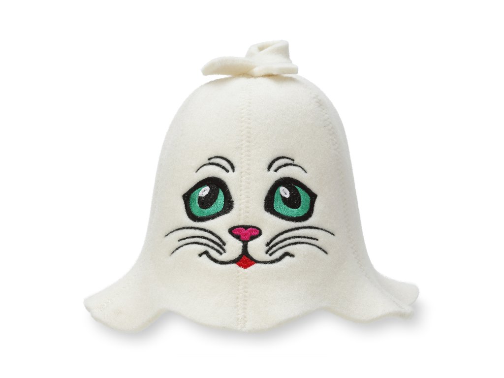 Veselá saunová čepice ze 100% vlny (filcová vlna) je dodávaná s veselým motivem zelenooké kočky. Vlněná čepice je určena pro děti pro použití v sauně. Díky použitému materiálu je čepice pevnější, odolnější a trvanlivější.