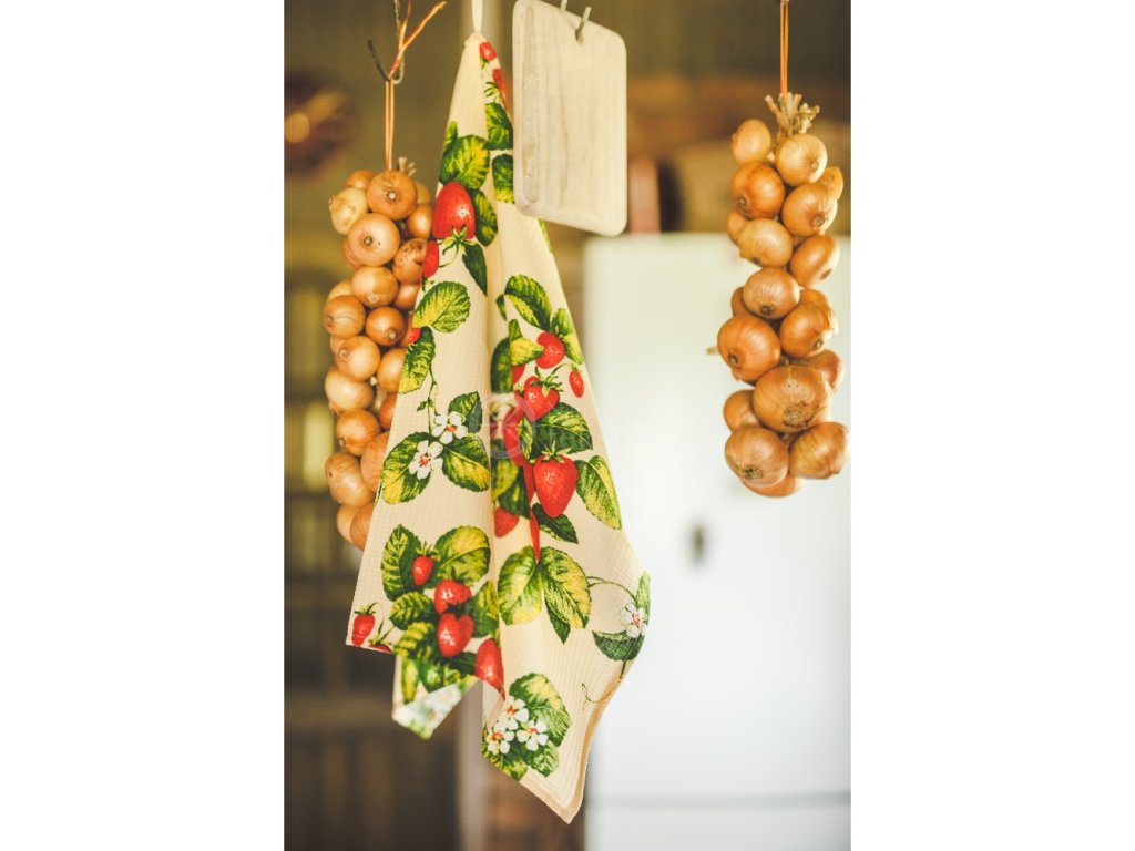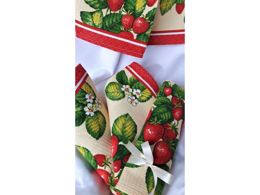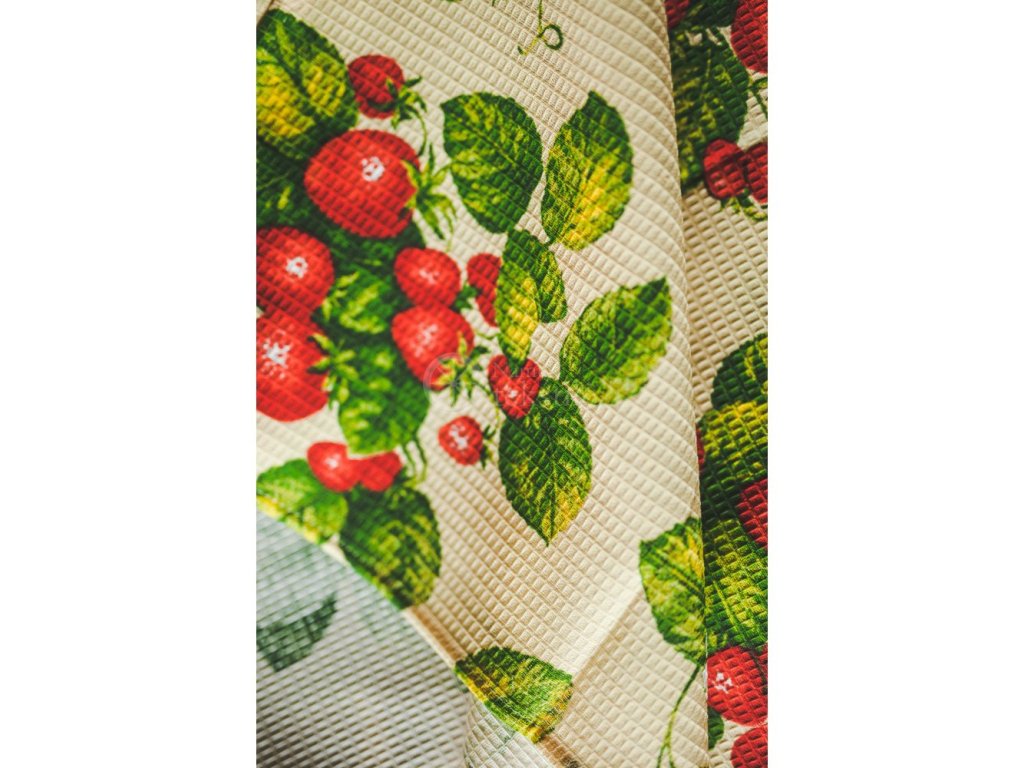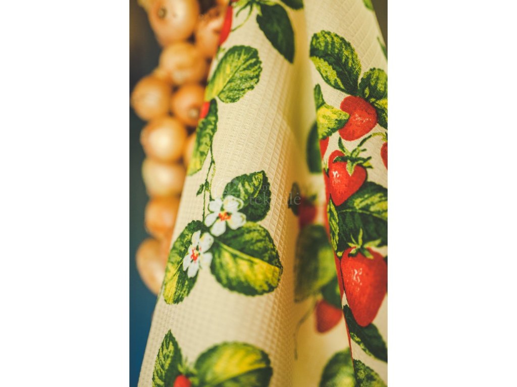 Bavlněná kuchyňská utěrka je zdobena krásným potiskem motivu jahod v červeném provedení s výraznými zelenými listy. Potisk je na světlém podkladu, díky čemuž vynikne sytost barev.