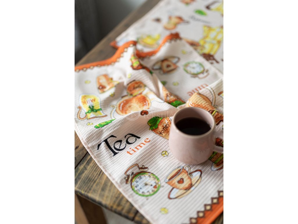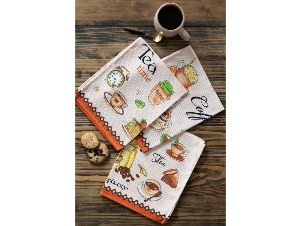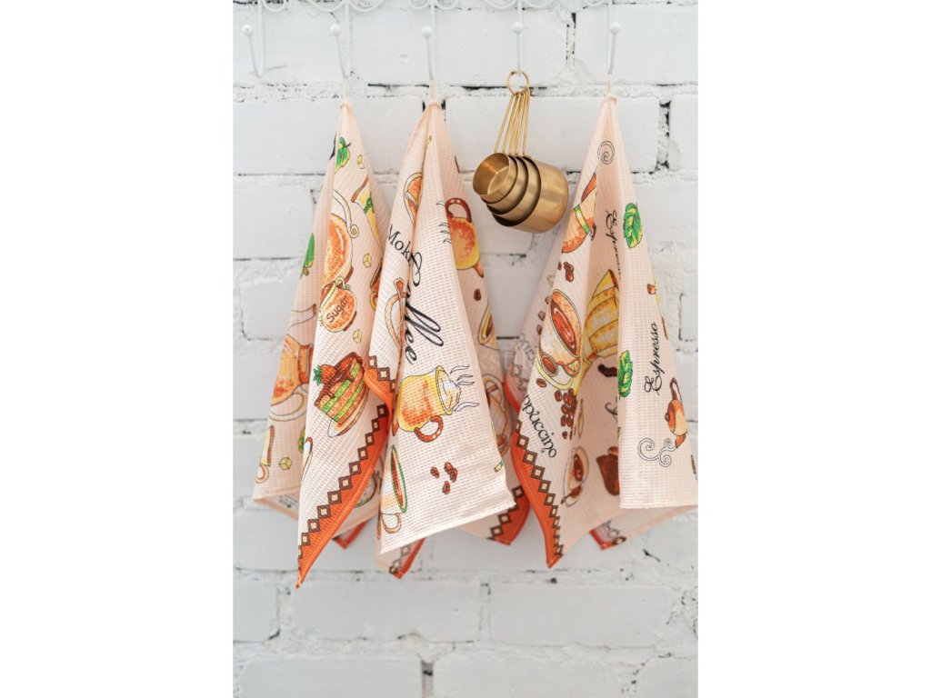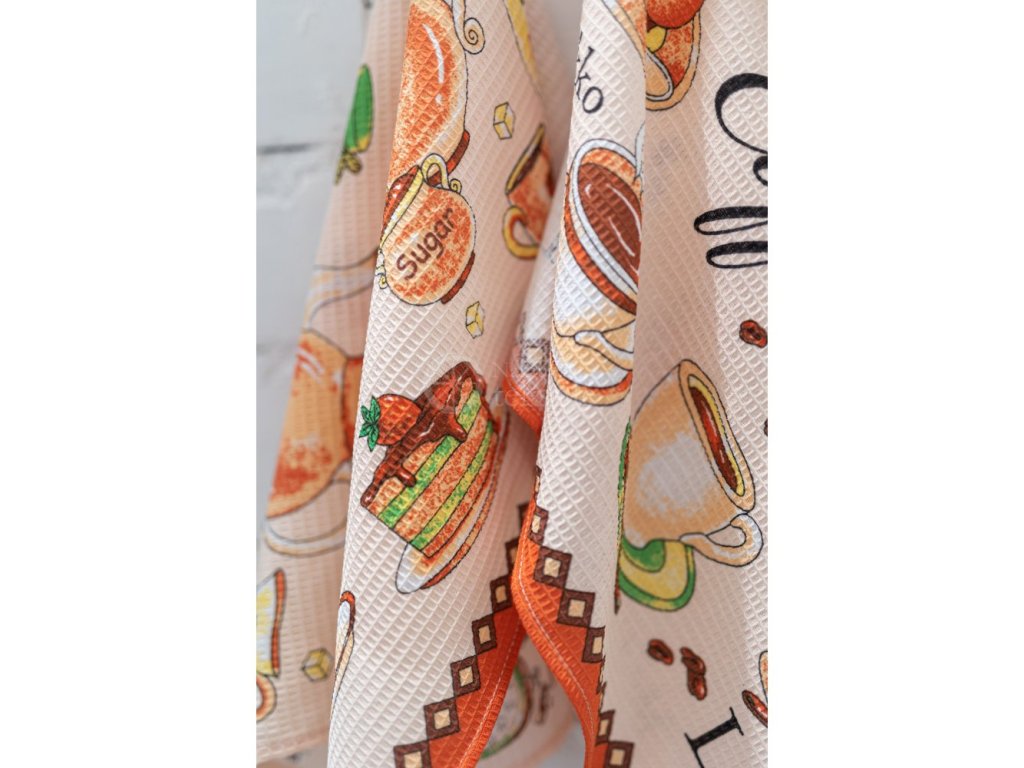 Vaflové kuchyňské utěrky ze 100% bavlny jsou dodávány v rozměru 50 x 70 cm v oranžovém základu s potiskem kávy a dortíků. Vaflový povrch je struktura připomínající mřížku (tedy vafle). Utěrky s vaflovým povrchem mají lepší absorpci vody a nečistot než utěrky bez tohoto povrchu.