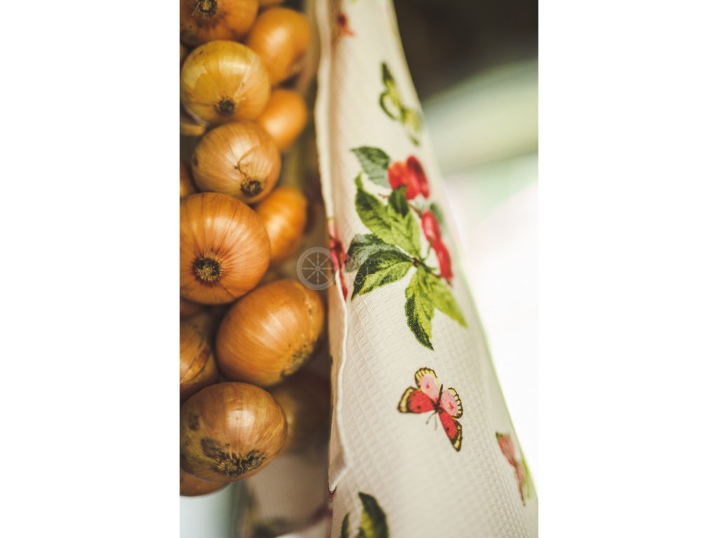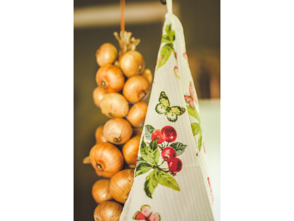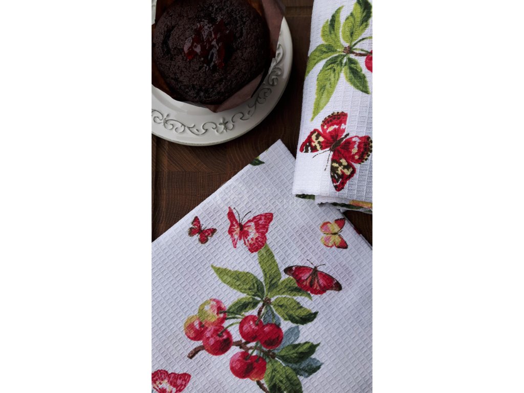 Bavlněná kuchyňská utěrka je zdobena krásným potiskem motivu višní a motýlků v červeném provedení s výraznými zelenými listy. Potisk je na světlém podkladu, díky čemuž vynikne sytost barev.
