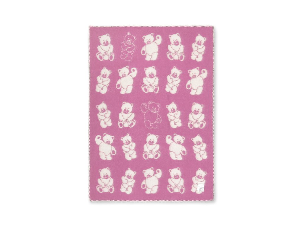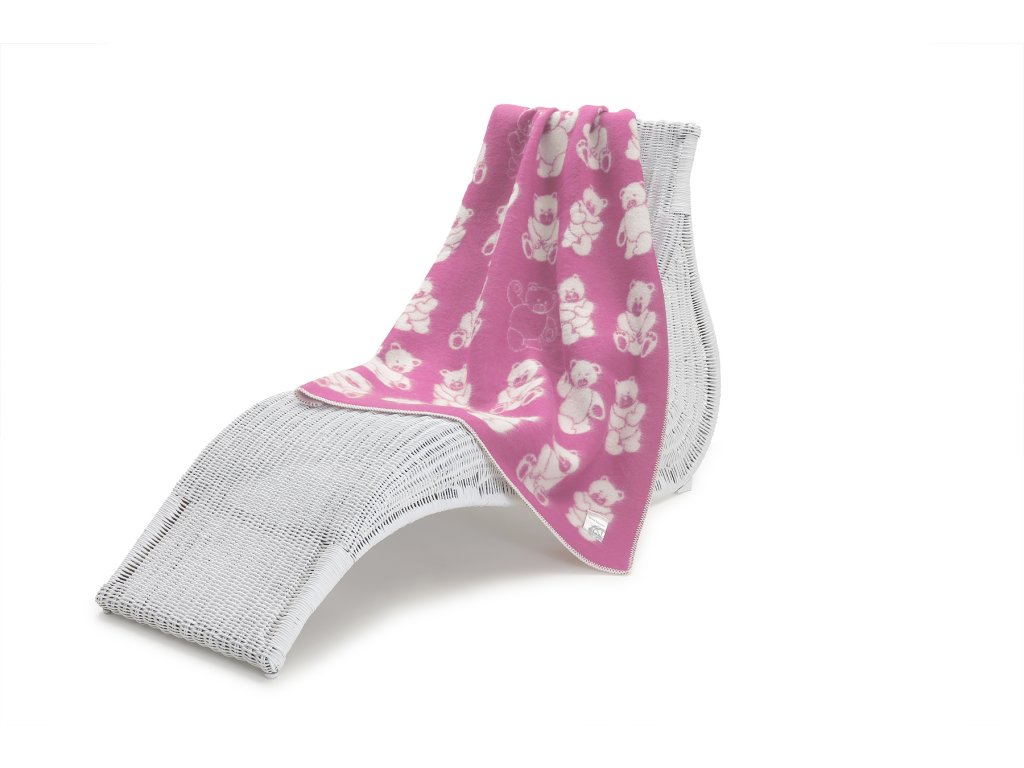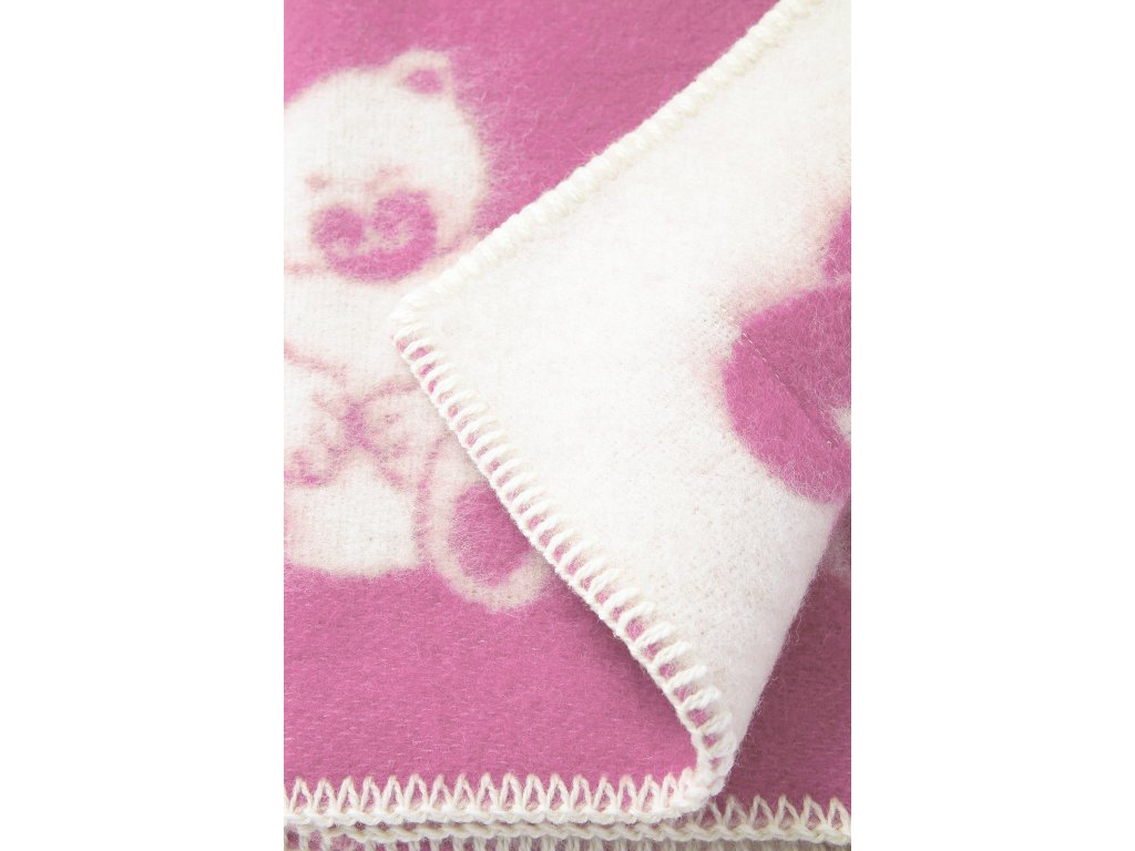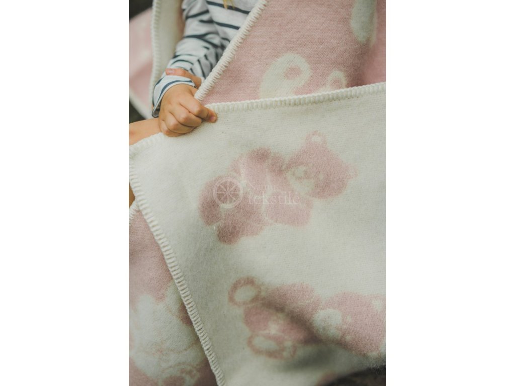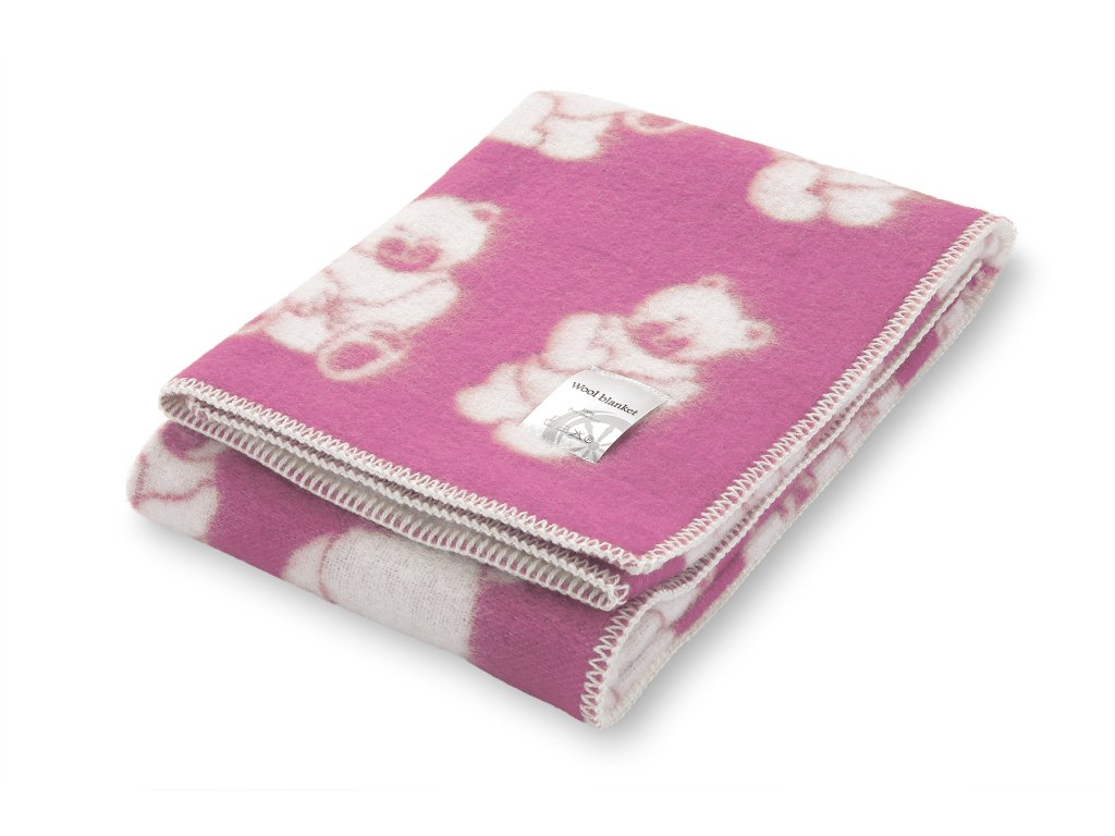 Materiál: 88% novozélandská ovčí vlna + 12% bavlna, Rozměr: 90 x 130 cm, Barva: růžová, Zobrazený motiv: medvídek, Hmotnost: 0,57 kg, Gramáž: 480g/m2
