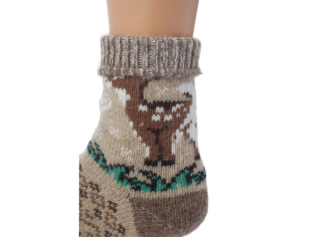 Vlněné ponožky s roztomilým Bambim mají světle hnědý základ. Spodní část ponožky je opatřena motivy čtverců v barevné kombinaci světle a tmavě hnědá. Ponožky jsou v lýtkové části opatřeny obrázkem srnečka Bambiho. Lem, pata a špička mají tmavě hnědou barvu.