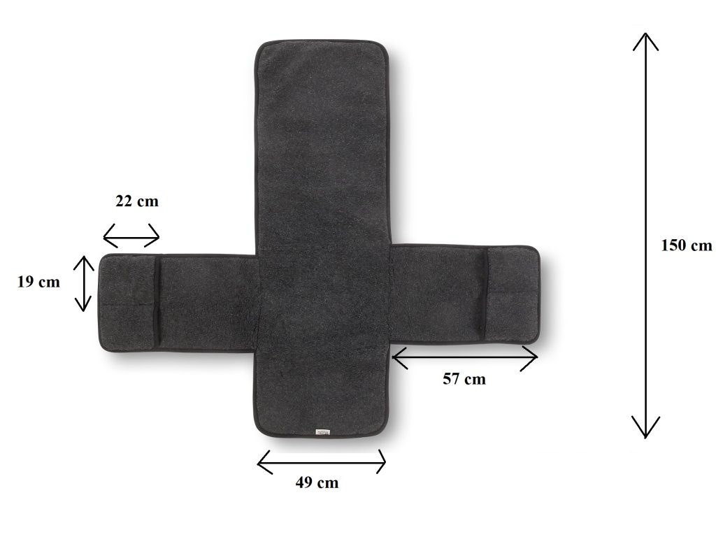 Ve spodní části potah volně splývá s hranou křesla. Potah má přesah o délce cca 4 cm přes okraj křesla. Vlněný podsedák na křeslo má napravo i nalevo bočnice, které se přehodí přes madla či strany křesla. Podsedák je vybaven praktickými kapsami na ovladač, dálkové ovládání či noviny. Tyto praktické kapsy jsou našity na levé i na pravé straně. Rozměr jedné kapsy je šířka 19 cm x výška 22 cm.